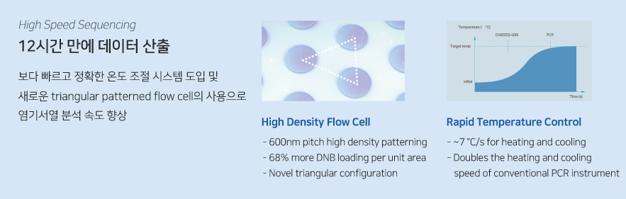DNBSEQ-G99는 12시간 만에 시퀀싱 데이터를 생성할 수 있는 초고속 염기서열 분석기로, DNB(DNA nanoball)와 Patterned Array Flow Cell 기술과 함께 신기술인 Triangular patterned (삼각 패턴 구조) 기술을 이용하여 정확한 염기서열 분석이 가능합니다.