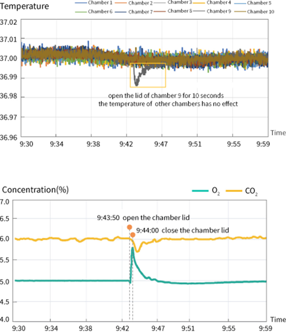 6면 온도 제어와 가스 예열 기능을 통해 ±0.1°C의 높은 정밀도를 유지하며, 외부 개입 후 1분 이내로 온도가 복구됩니다. CO₂ 및 O₂ 가스 농도도 ±0.1% 정밀도로 제어되며, 2.5분 이내에 복구됩니다.