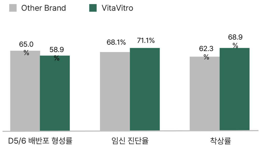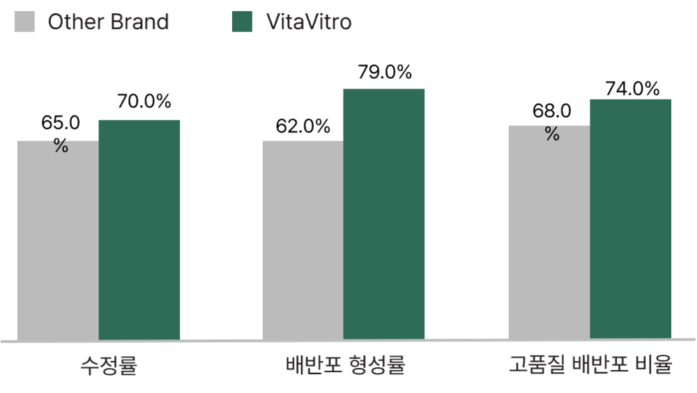 - 화학적 활성화 시점, 포도당 양상 등 까다로운 조건을 통해 인체 배아와 유사성이 높은 배아 배양액의 안전성 및 생체 적합성을 선행적으로 검증하여 신뢰도를 극대화합니다.